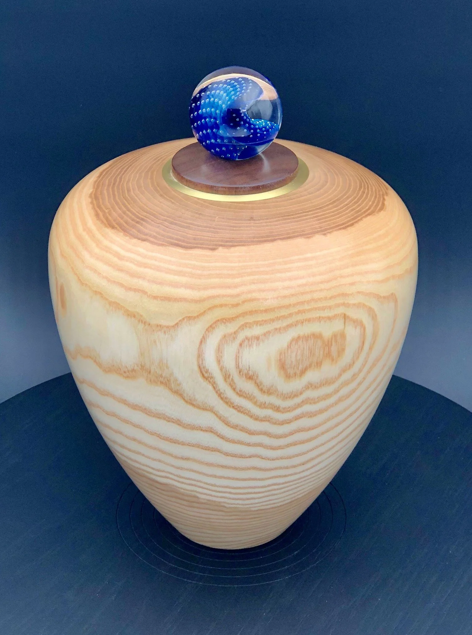 White ash is a beautiful wood with bold grain pattern, white sapwood, and a warm brown heartwood. The sapwood of this urn has a very interesting, pronounced grain pattern and the heartwood is quite large, the overall effect makes this urn especially beautiful. The Black walnut lid is threaded into the urn with a finely machined threaded brass insert. Both the urn and lid have a hand rubbed lacquer finish. An amazing solid glass Gravitron Planet by Josh Simpson sits in a recess in the lid so you can remove it. You will want to hold the Planet in your hand to examine it as you consider…..the past, the future, the possibilities, the universe……