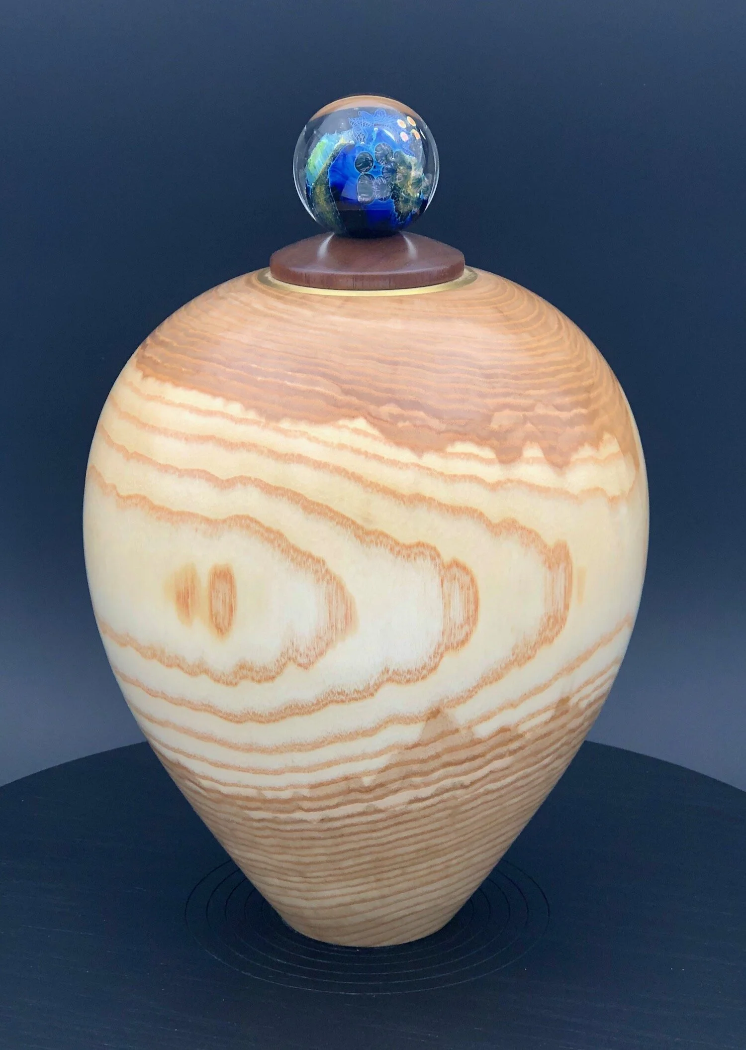White ash is a beautiful wood with bold grain pattern, white sapwood, and a warm brown heartwood. The sapwood of this urn has a very interesting, pronounced grain pattern and the heartwood is quite large, the overall effect makes this urn especially beautiful. The Black walnut lid is threaded into the urn with a finely machined threaded brass insert. Both the urn and lid have a hand rubbed lacquer finish. An amazing solid glass Inhabited Planet by Josh Simpson sits in a recess in the lid so you can remove it. You will want to hold the Planet in your hand to examine it as you consider…..the past, the future, the possibilities, the universe……
